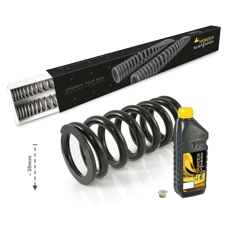 Kit de reducción de altura de Touratech Suspension , del especialista holandés Hyperpro. Incluye muelles de repuesto para la horquilla y un muelle de repuesto para el amortiguador. Este juego de muelles proporciona una sensible reducción de 30 mm en la altura sin afectar la conducción, a costa de una pequeña distancia al suelo. Los muelles progresivos se han diseñado para adaptarse perfectamente a la BMW F700GS y ofrecen una respuesta mejorada y mayor seguridad en situaciones extremas. Reemplazar los muelles delanteros y traseros mejorará significativamente el sistema de suspensión. Homologado para circular en carretera.