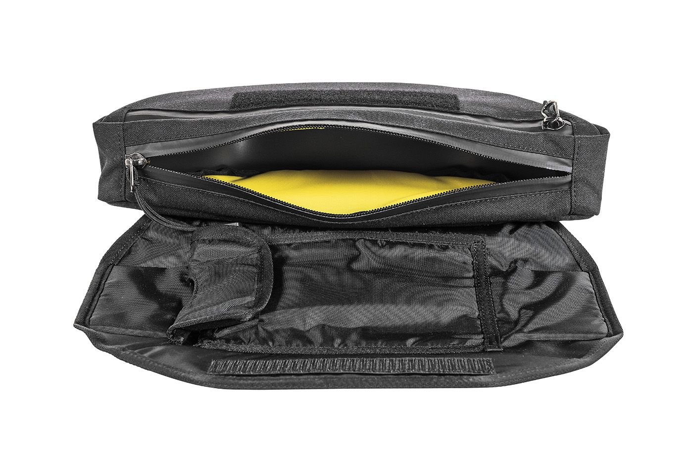 Debajo de la tapa hay un gran compartimento principal impermeable (aprox. 2.4 litros) para los botiquines de primeros auxilios, chalecos de alta visibilidad o gafas de sol. Un compartimento más pequeño permite un acceso rápido a los documentos importantes y otros artículos pequeños. El forro amarillo te ayuda a encontrar el contenido de la bolsa más fácilmente.