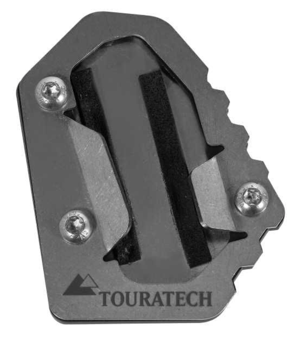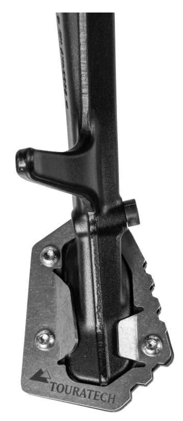 Cualquier boxer de 1300cc cargado hasta los topes de equipaje estará contento con la superficie de apoyo del 200 % de la extensión del soporte del caballete lateral de Touratech.