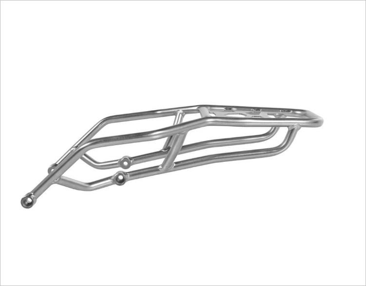 El soporte superior, fabricado íntegramente en acero inoxidable, se corta con láser tubular, se dobla mediante CNC y se suelda a mano con precisión. La superficie se granalla dos veces y se somete a un pulido electrolítico. Gracias a este proceso de refinamiento, la superficie resulta prácticamente indestructible y extremadamente duradera.